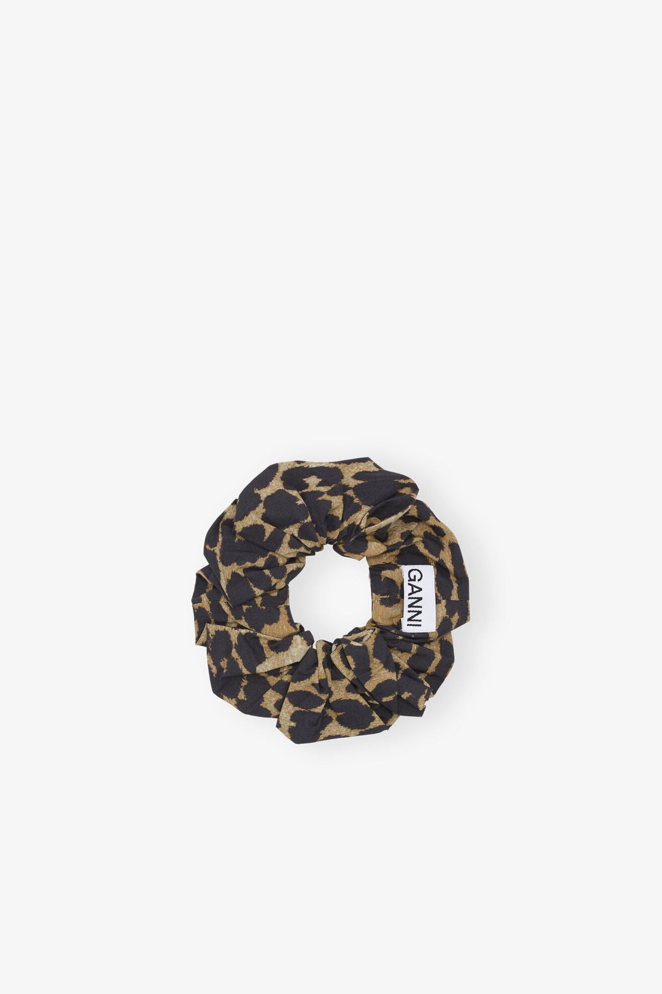 This scrunchie features a leopard print and a sewn-on GANNI logo patch.