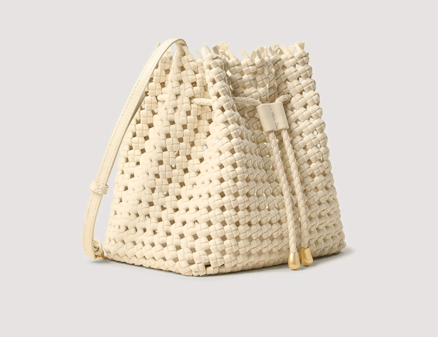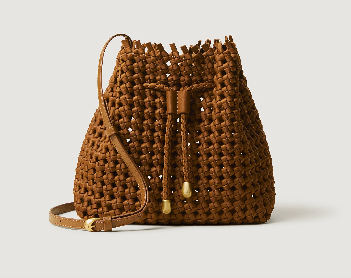 The Mallorca Bucket Bag is an airy update on the classic bucket bag. Handwoven from our signature neoprene in saddle brown, this artisanal bag is lighweight and spacious, perfect for warm-weather style—at home or away. Finished with a braided drawstring closure and adjustable leather strap.