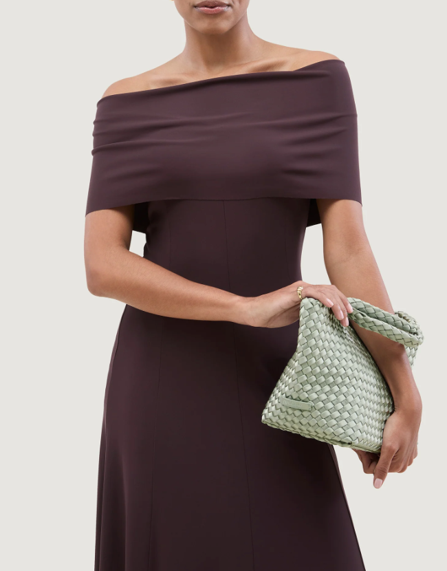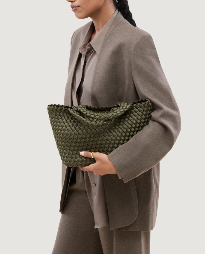 The St. Barths Small Tote debuts in handwoven aqua green satin as part of our Holiday ’25 collection. This elegant satin handbag is reimagined to transition seamlessly from day to evening—ideal as an everyday tote, work-to-weekend bag, or holiday party accessory.