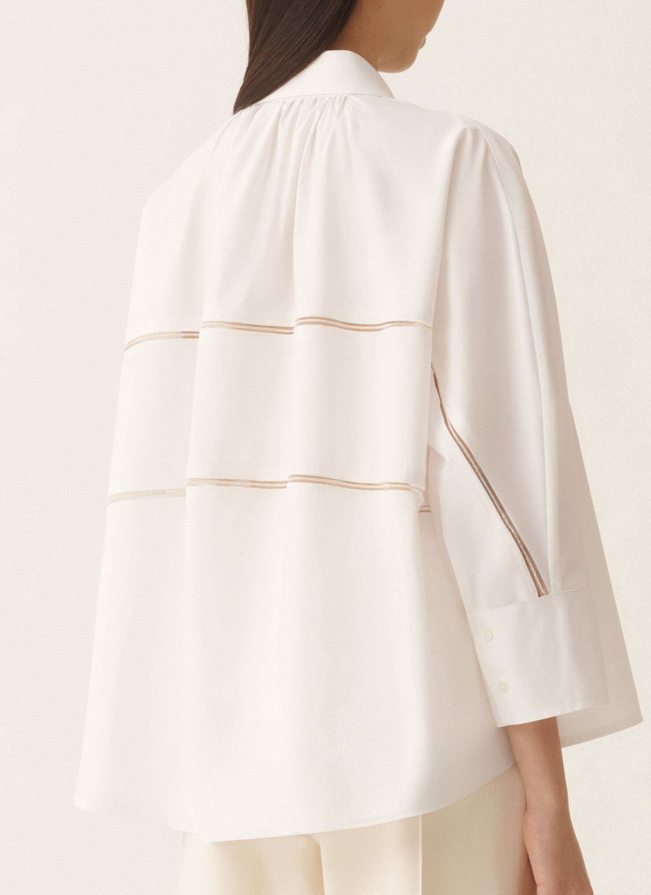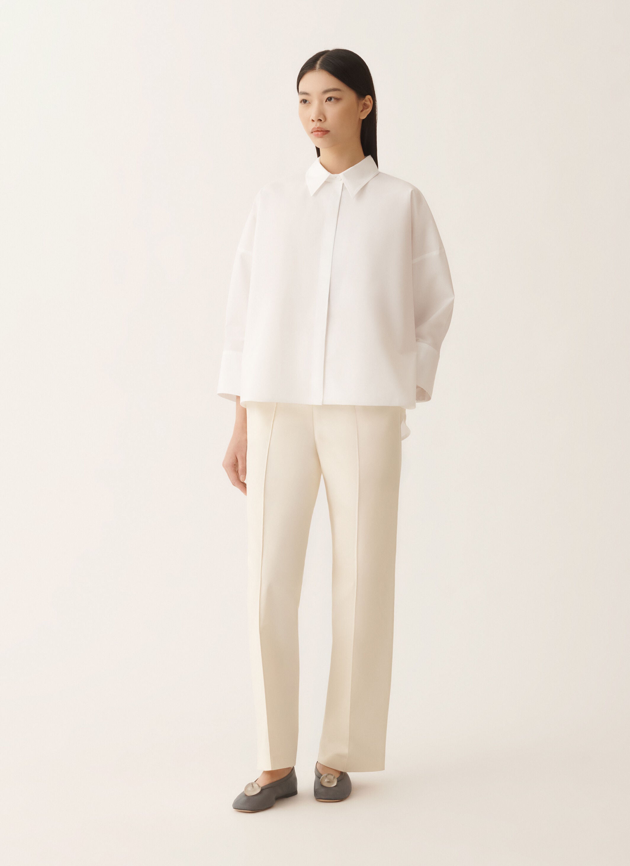 This cropped ¾ sleeve poplin shirt combines timeless elegance with a contemporary silhouette, enhanced by the stitching on the back. Entirely made in Italy using sustainable processes.