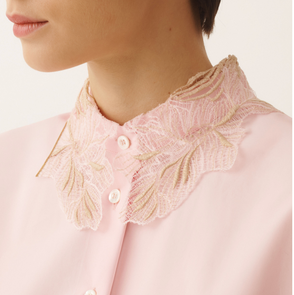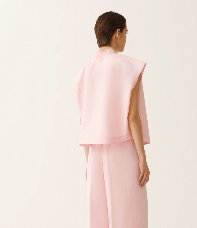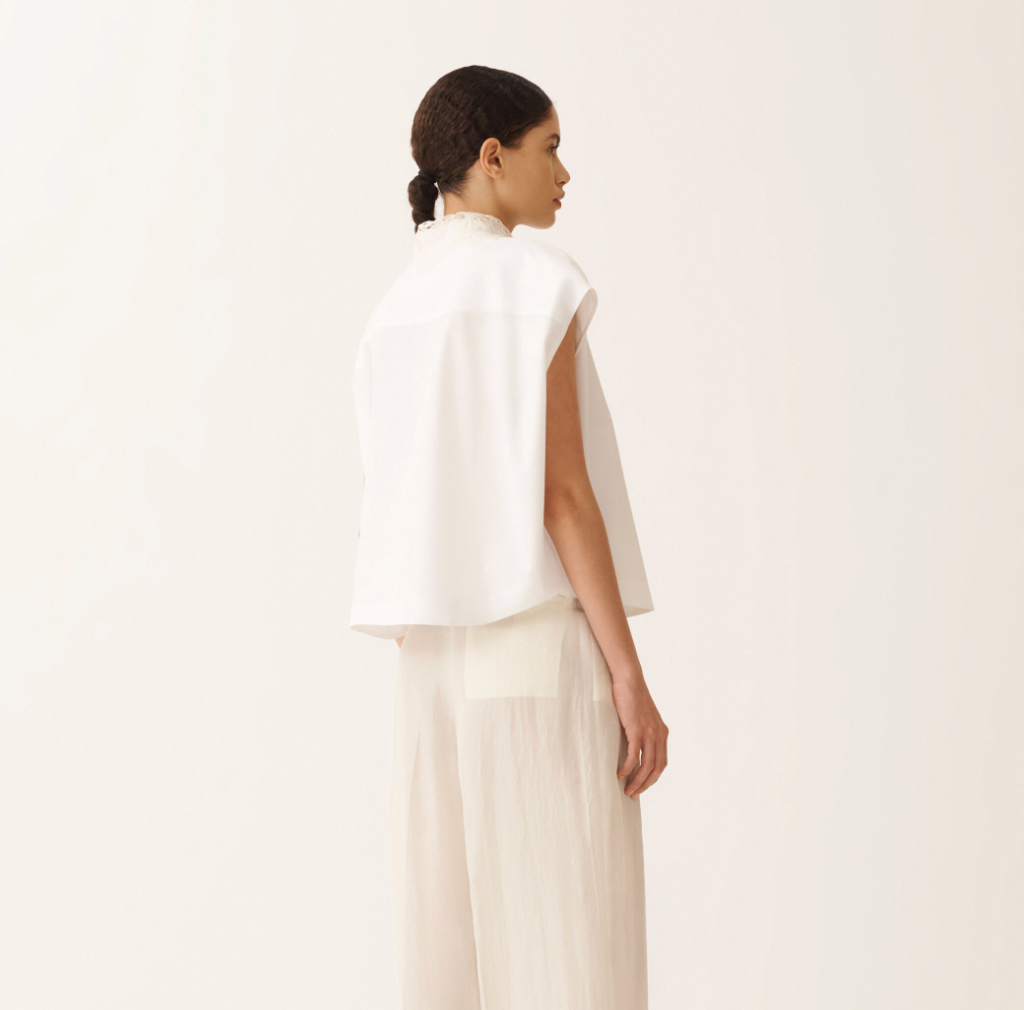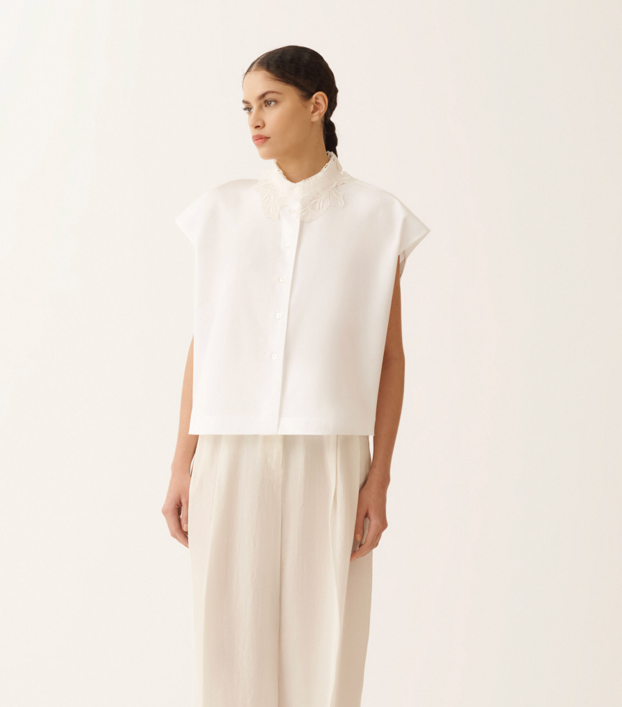 This sleeveless cotton poplin shirt with a mandarin collar stands out for its refined texture, achieved through sophisticated weaving techniques and fine yarns. The tone-on-tone lace collar enriches the design with understated elegance. Featuring an oversized silhouette, it is crafted in Italy through sustainable processes.Poplin