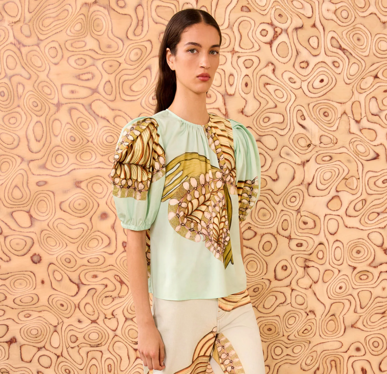 Cut from poplin with a satin finish, the Ravena Top is an artful silhouette in pattern and shape—the fluid botanicals are magnified from the work of Art Brut painter Anna Zemánková, while the puffed sleeves are signature to the Ulla Johnson design heritage.