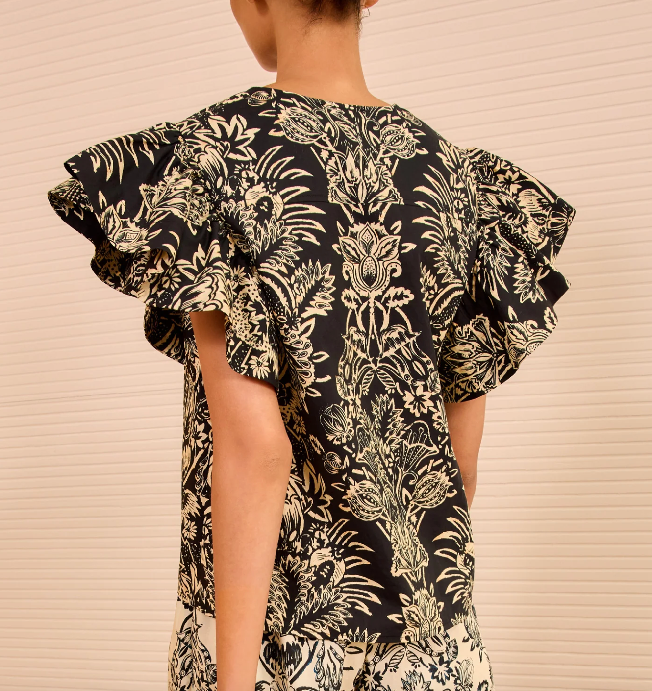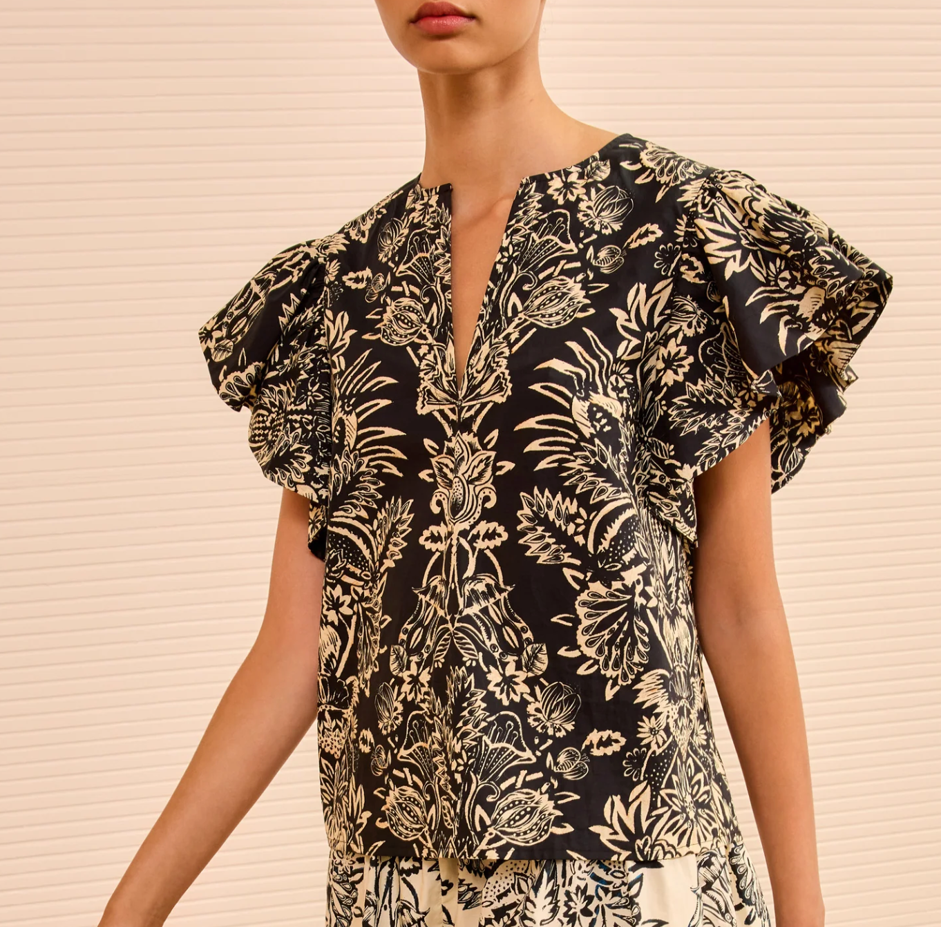 Crafted from cotton poplin, the Severine Top is richly graphic with a symmetrical botanical print infused with subtle, batik textures. This black and ivory top features signature flutter sleeves and is loose in form for easy styling with denim or tailoring.