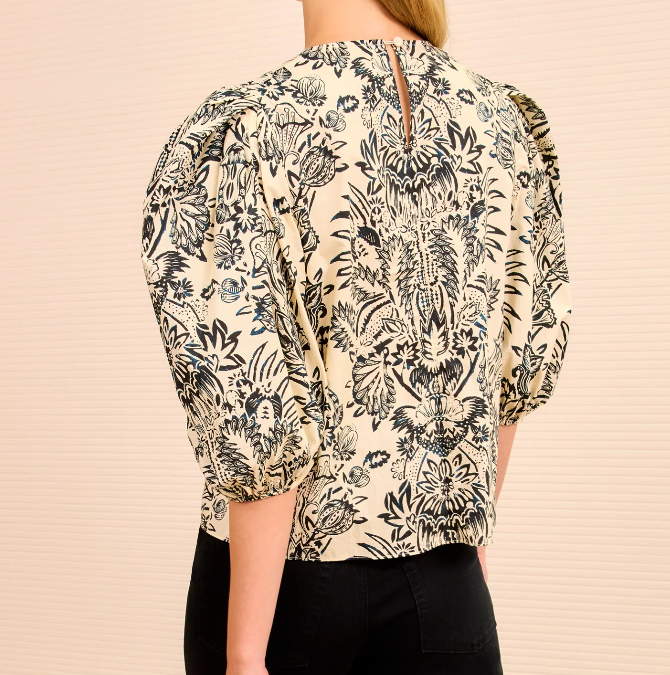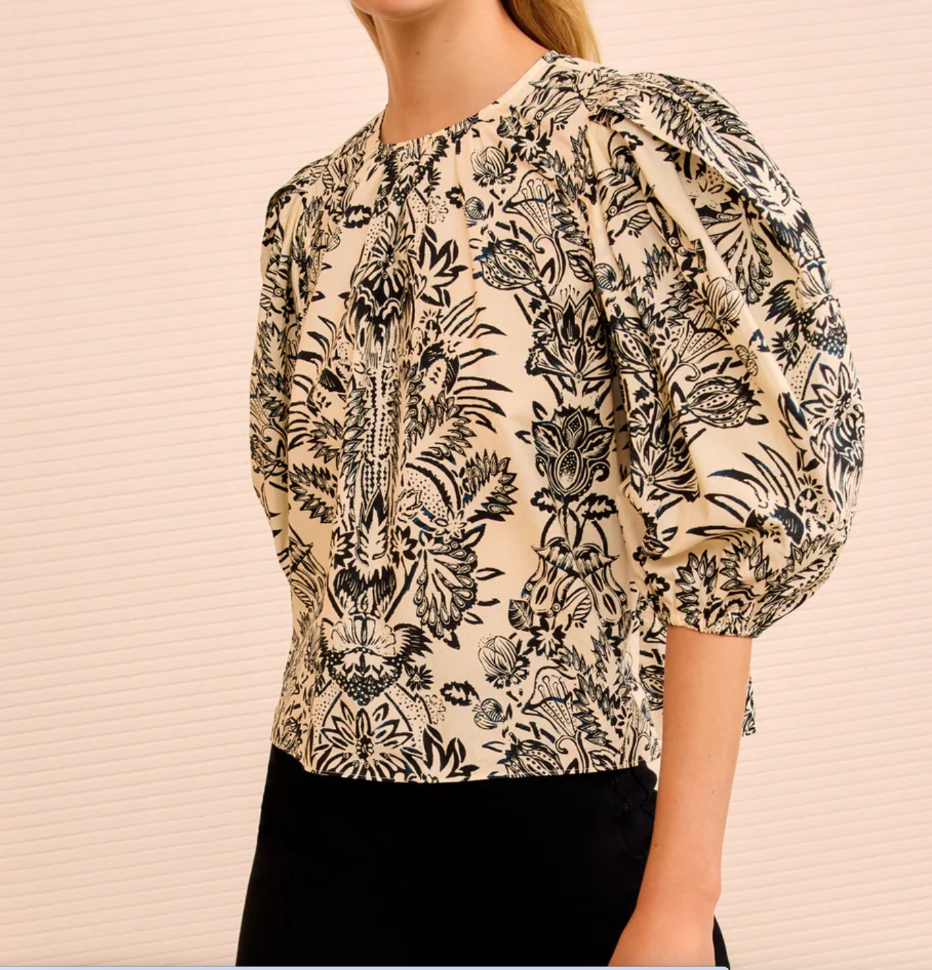 The Frantiska Top is made from ivory poplin imbued with a blend of noir, symmetrical florals and subtle batik textures. This iconic Ulla Johnson silhouette is adorned with puffed sleeves and has a relaxed, effortless fit for easy versatility.