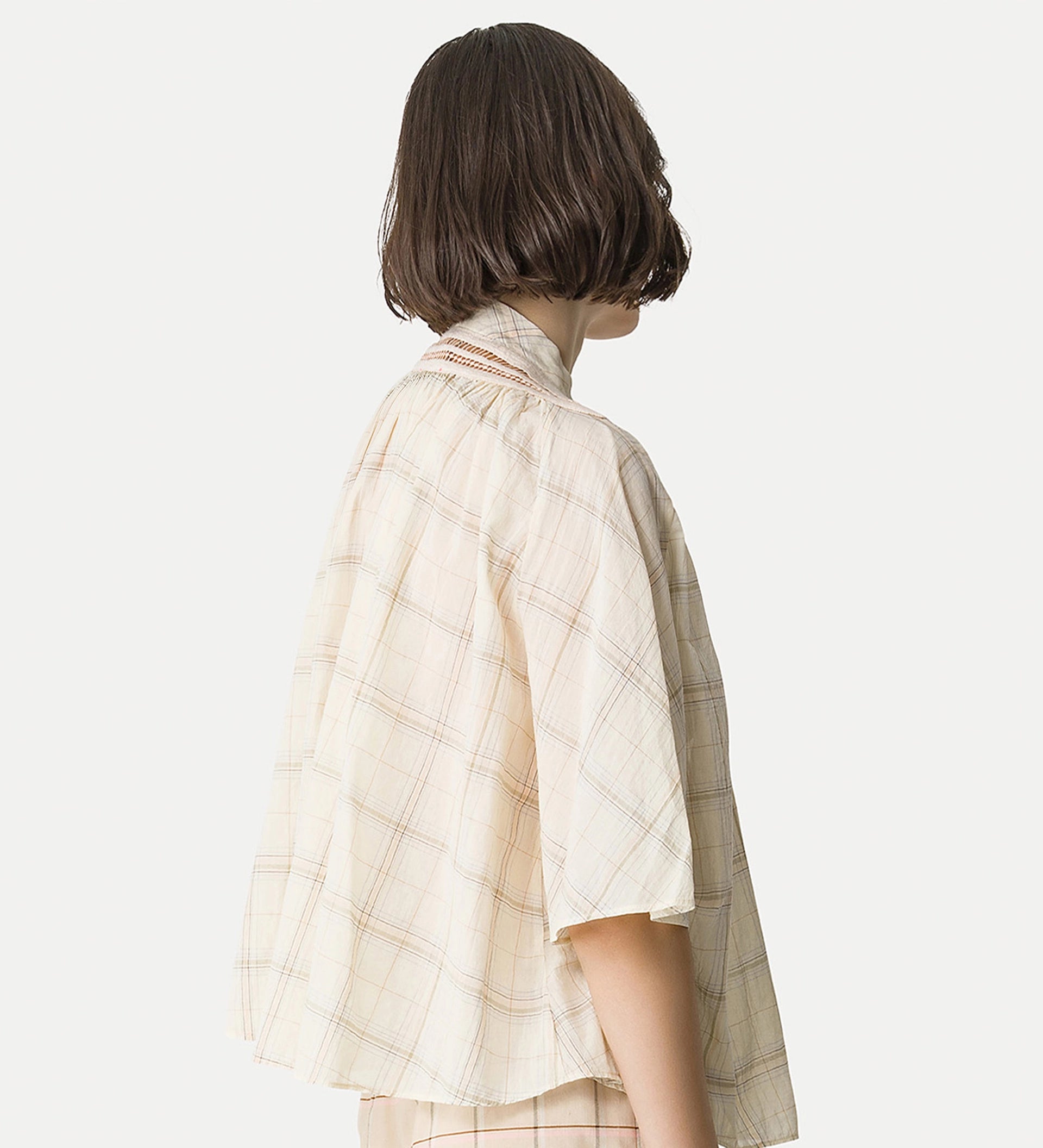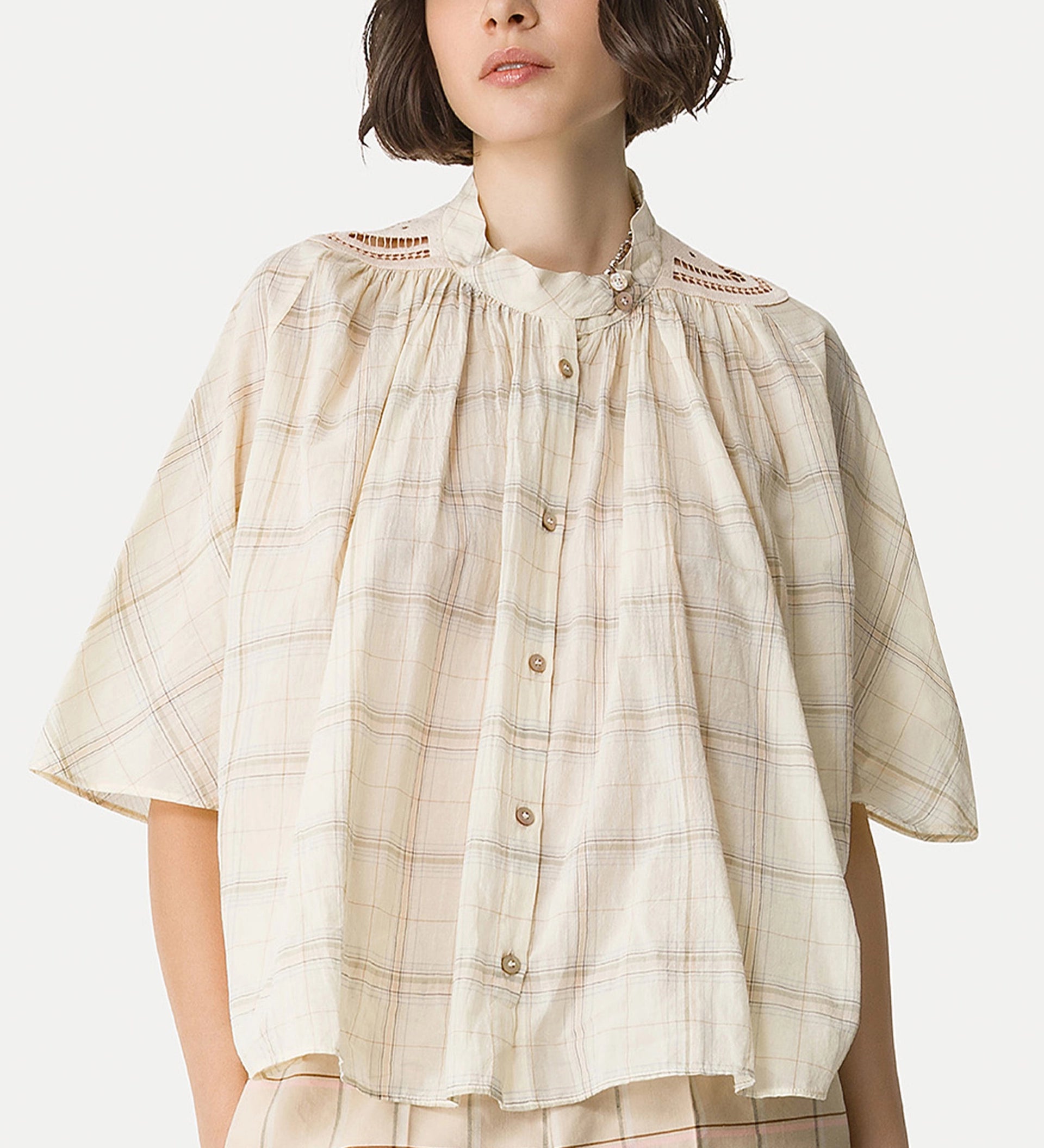 following the footsteps of iconic bohemian shirts, this half—sleeve voile blouse celebrates the lightness of its materials, with romantic gathers at the neckline and a soft, airy volume. small openwork inlays break up the tartan’s geometry, enriched by delicate macramé embroidery. mother—of—pearl buttons add the final romantic touch, making this voile shirt a true spring must—have.