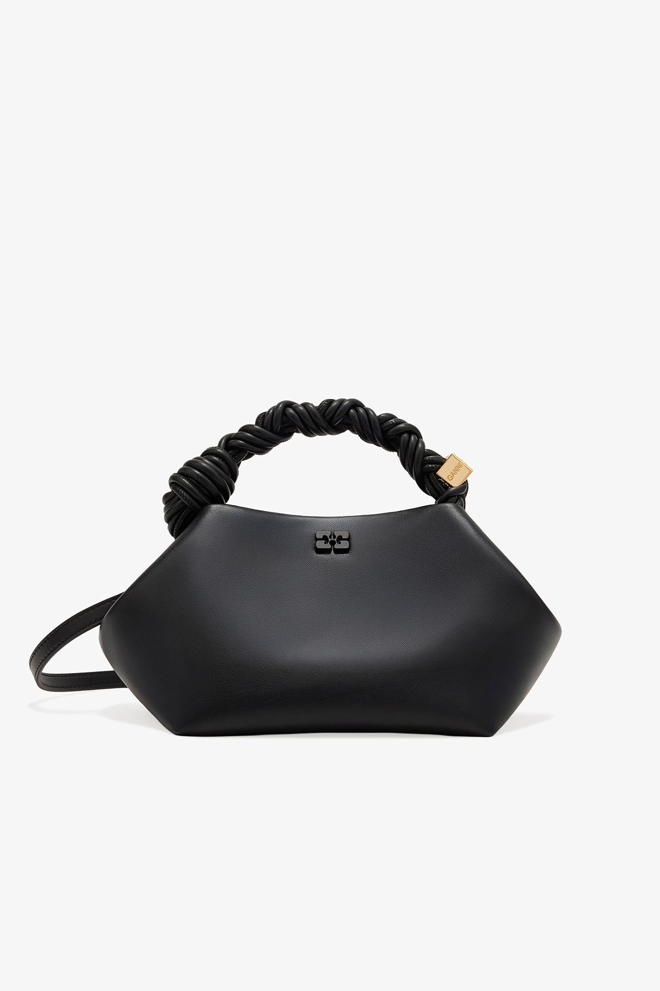 This bag features a tone-on-tone metallic GANNI Butterfly logo, a twisted handle with a braided knot, and a gold-tone metallic dice with a GANNI Butterfly logo engraved. The bag has an internal magnetic closure, a flat card pocket inside, and an adjustable and removable shoulder strap for crossbody wear