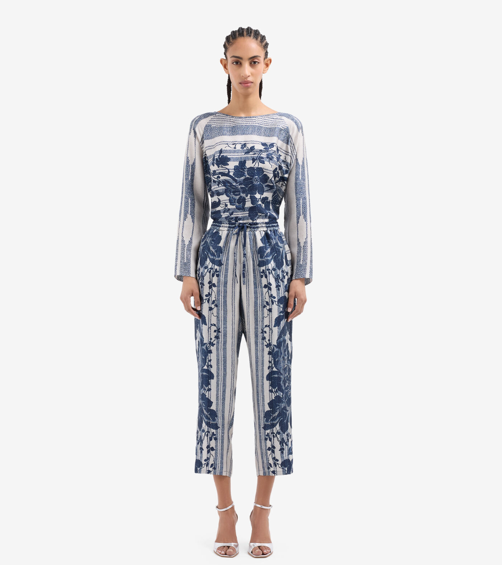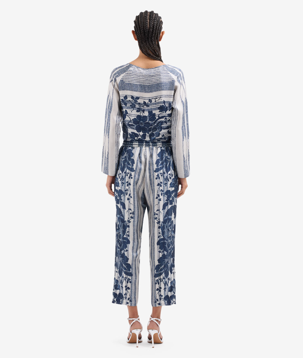 These exquisite straight-leg pants feature a harmonious blend of intricate navy floral motifs and subtle stripes, evoking a sense of vintage elegance. Crafted with an elastic waistband for comfort and fluidity, they offer a seamless blend of artistic expression and modern design. Pair with a tailored blouse for a refined and sophisticated ensemble.
