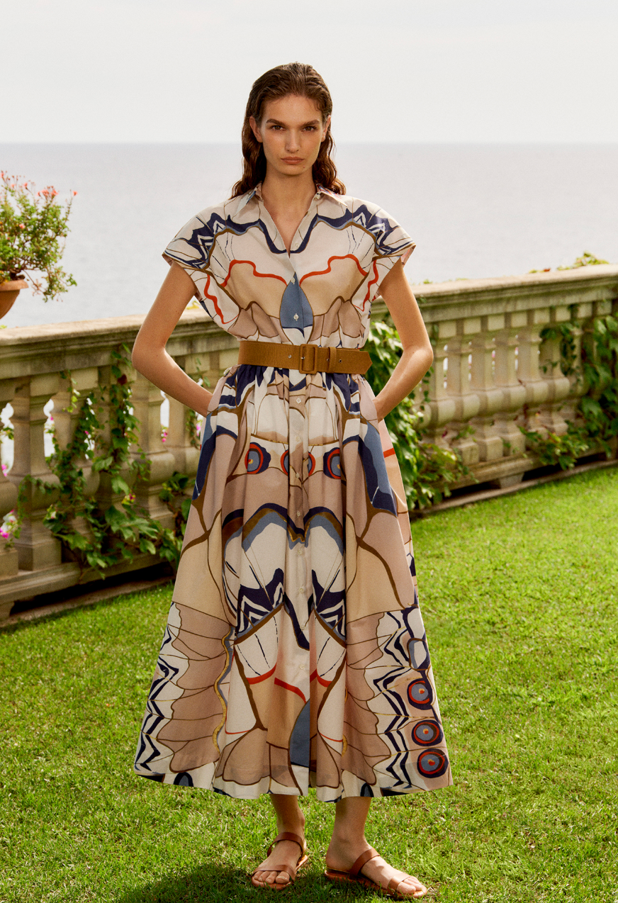 Edrina 90 midi length cap sleeve button-down shirtdress with full skirt in cotton poplin, multicolour blush, white, blue and navy graphic macro butterfly print. Belt in own fabric included. Edrina 90 midi cap sleeve button-down shirtdress with full skirt in silk cotton gingham voile. Floral print in shades of beige and white. Grosgrain covered belt included, colour blue navy.