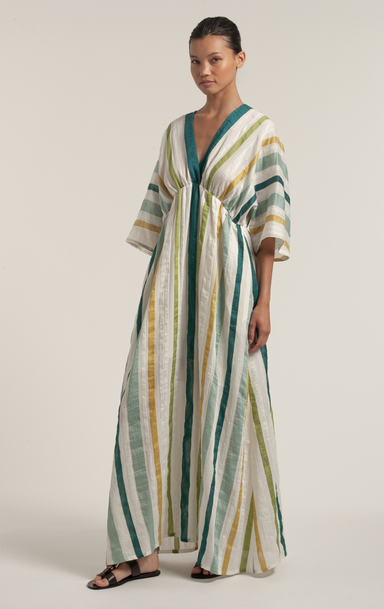 Keke105 long kimono sleeve pull on dress with deep v-neckline. Elastic under the bust. Multicolour lime aqua and teal stripe on off white ground.