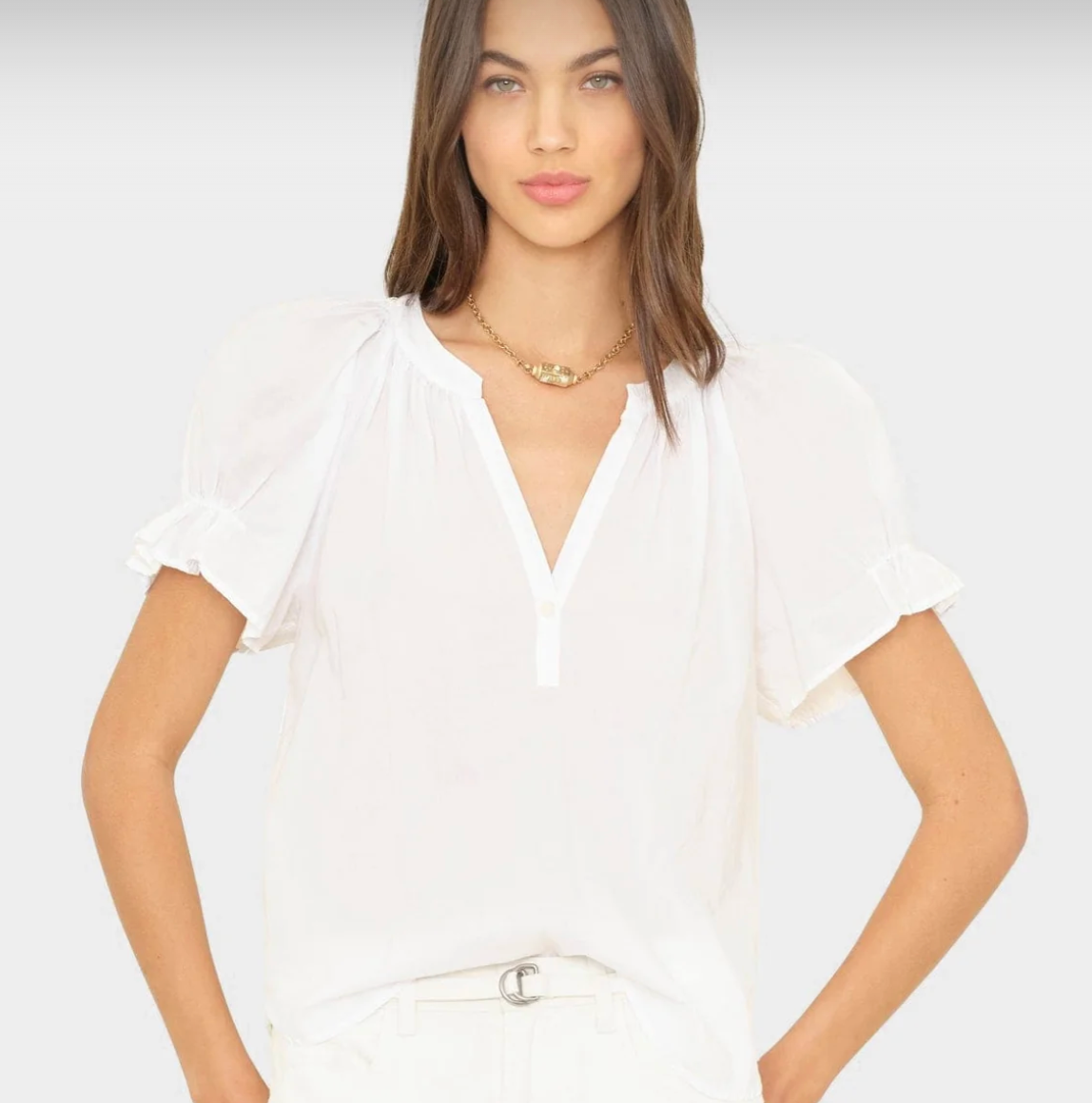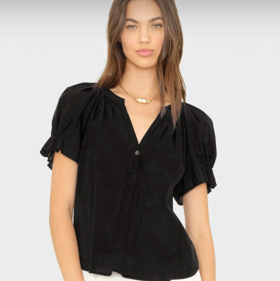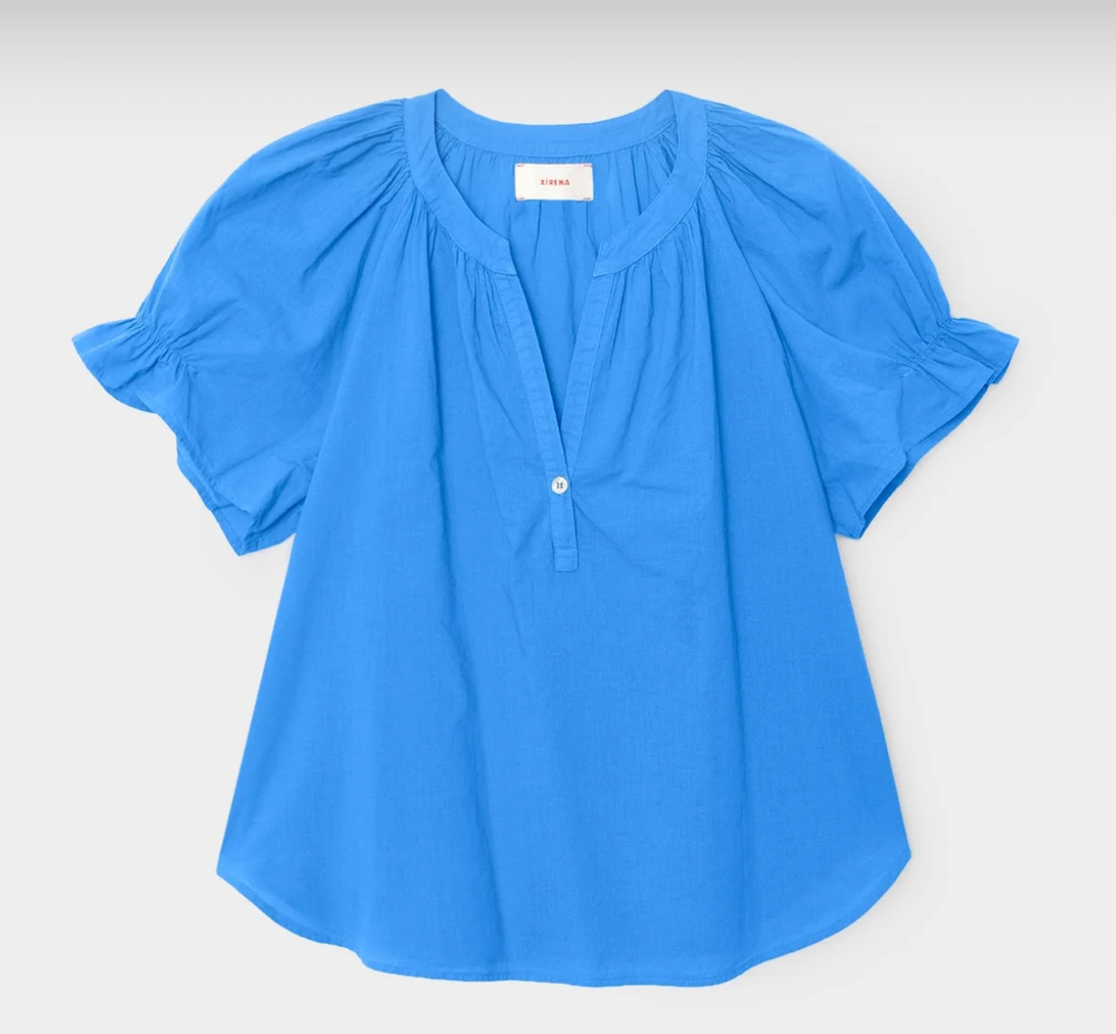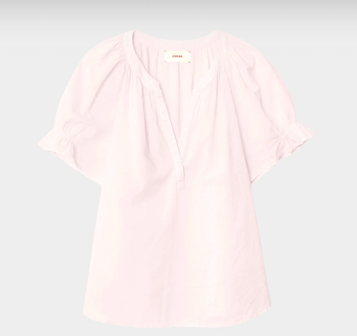 Pretty Please. Astryde is made in our classic lightweight woven cotton poplin for a lived-in look and feel. Astryde is a femme V-neck blouse that features a singular button-closure, short puff raglan sleeves with elastic ruffles, and shirred details throughout.